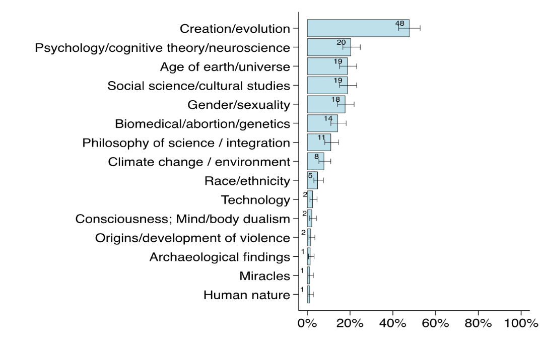 While we found that ecclesial family is not a predictor of a school’s engagement with science (i.e., Evangelical and Mainline schools were equally likely to engage), when faculty did face student resistance, it was typically around certain controversial issues. Over 60% of the faculty surveyed identified a range of scientific issues that typically provoke controversy among students (see Fig 1).